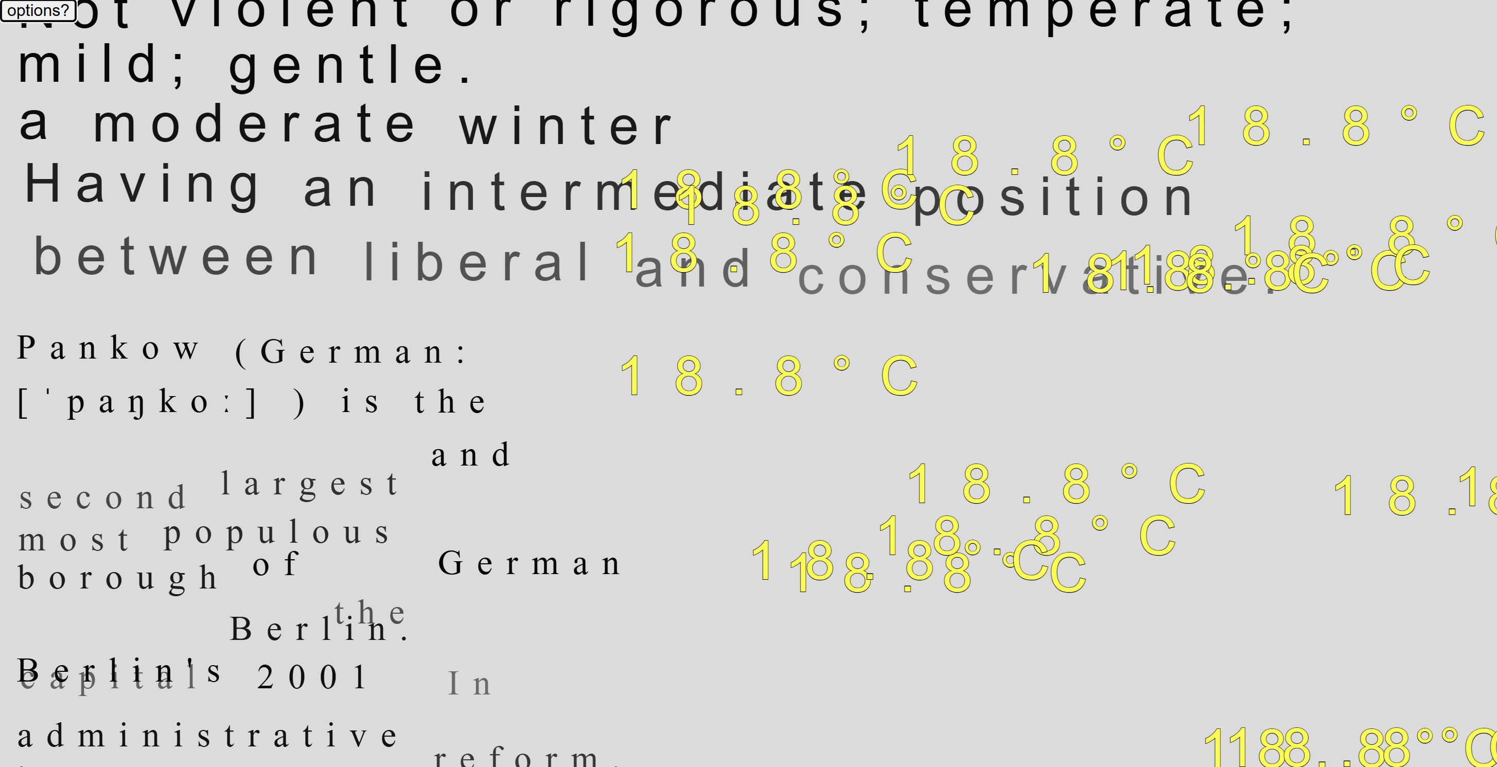 Diese Webseite ist im Kurs "Stay a while and listen" von Johannes Schmoll an der Universität der Künste Berlin im Sommersemester 25 entstanden. Es ist ein typografisches Experiment in dem verschieden Textgestaltungsparameter von Wetterdaten und Zeit beinflusst sind. Der Standort wird erfasst um die aktuellen Wetterdaten durch eine API zu erhalten. Diese Parameter kann man an und ausstellen um zu sehen wie die Wetterdaten des Ortes wo die Webseite aufgerufen wird die Gestaltung beeinflussen. Das heißt die Webseite gestaltet sich wie autonom von selbst. Momentan ist die Seite noch ein Prototyp, aber ich möchte die Seite weiterentwickeln um die Seite noch adaptiver zu Ort und Zeit zu gestalten.