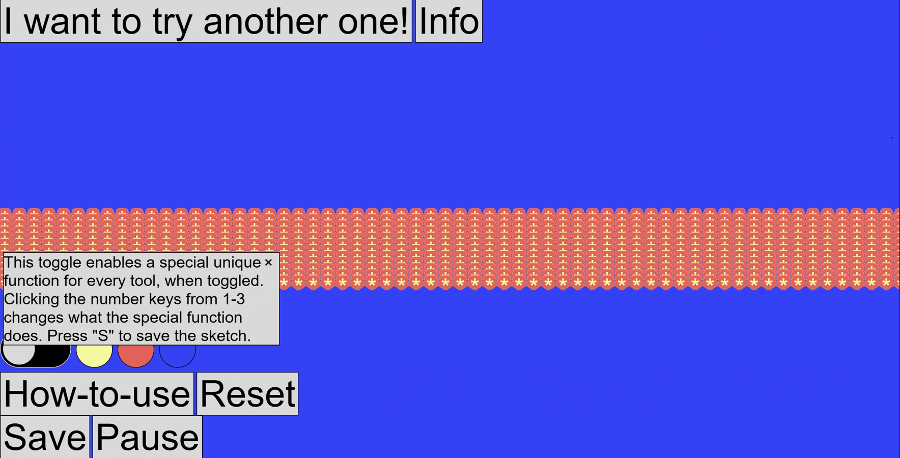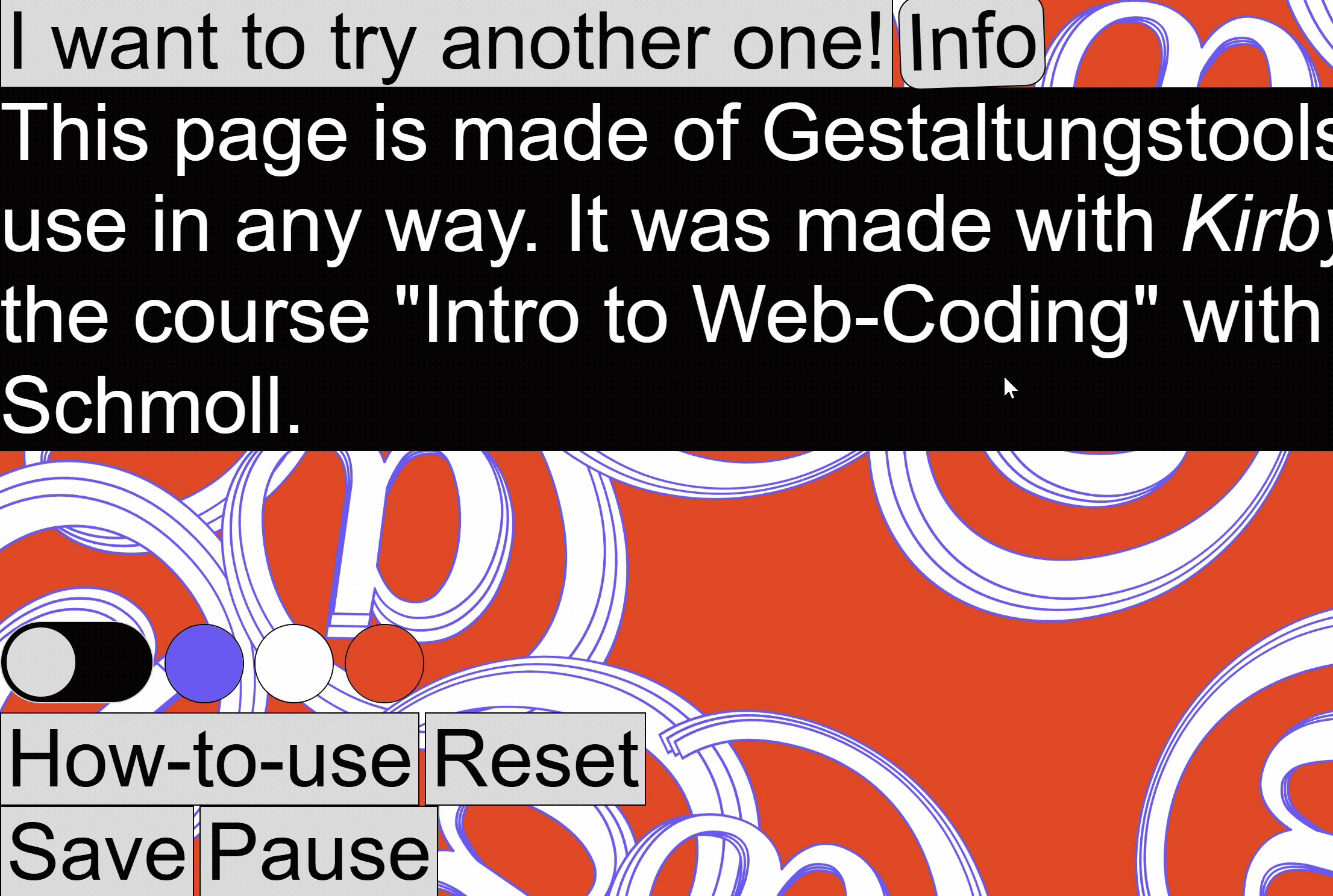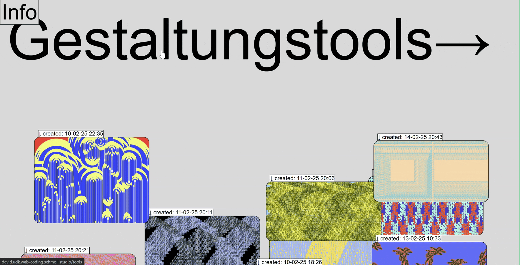 Diese Webseite ist im Kurs "Intro to Web-Coding" von Johannes Schmoll im Wintersemester 24/25 an der Universität der Künste Berlin entstanden. Sie erkundet das Potenzial von Creative Coding als gestalterisches Tool um Grafiken zu generieren und zu steuern durch Mausbewegung. Es sind mehrere Vorlagen enthalten, mit denen man auf unterschiedliche Weise Bilder erzeugen kann. Dies stellt eine Alternative dar zu herkömmlichen Tools der Bilderzeugung wozu beispielsweise Adobe Photoshop dazu gehört oder auch Stift und Papier. Durch speichern einer eigenen Grafik erhält man Zugang zu einer Galerie in der schon gespeicherte Grafiken des Gestaltungstools zu sehen sind.