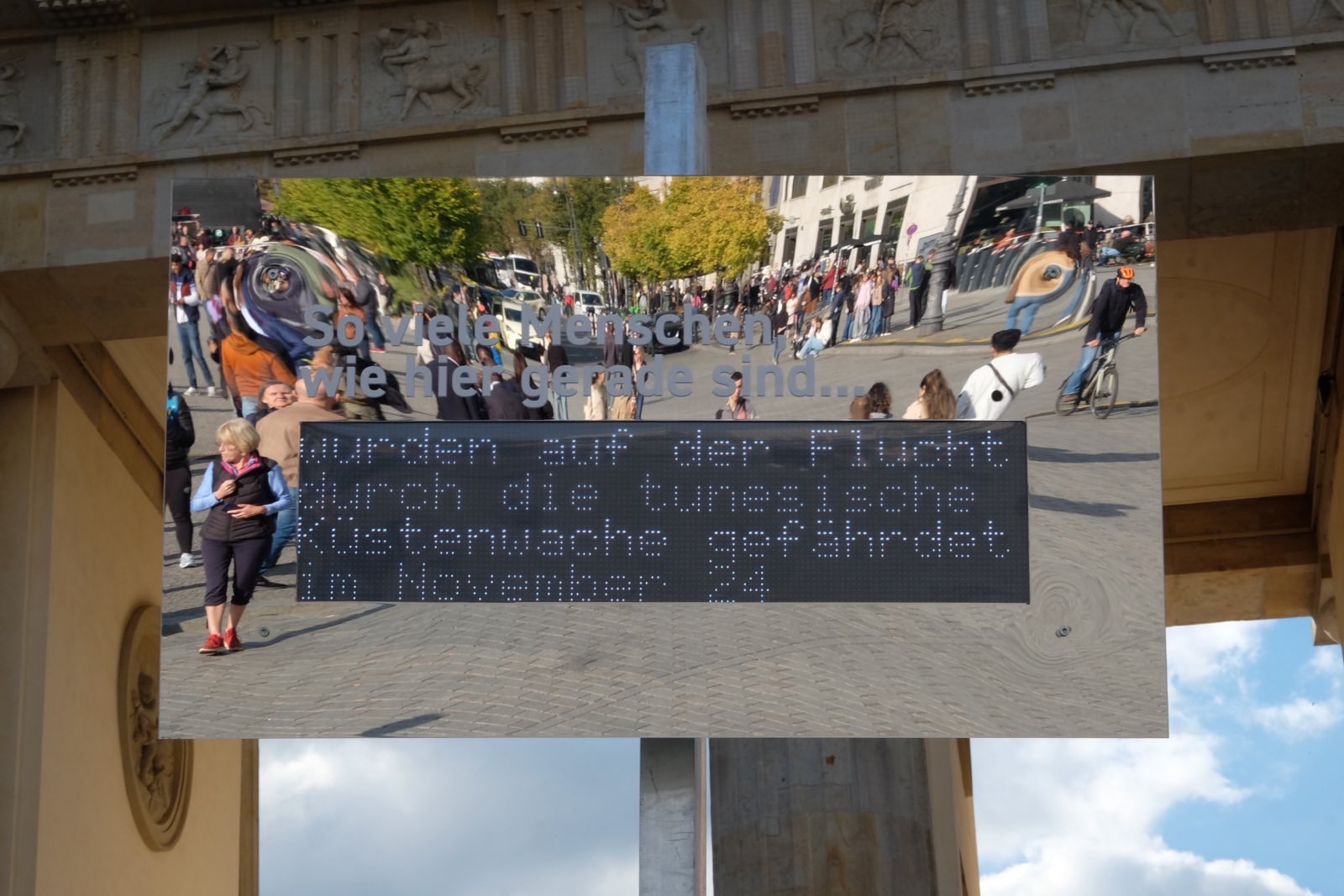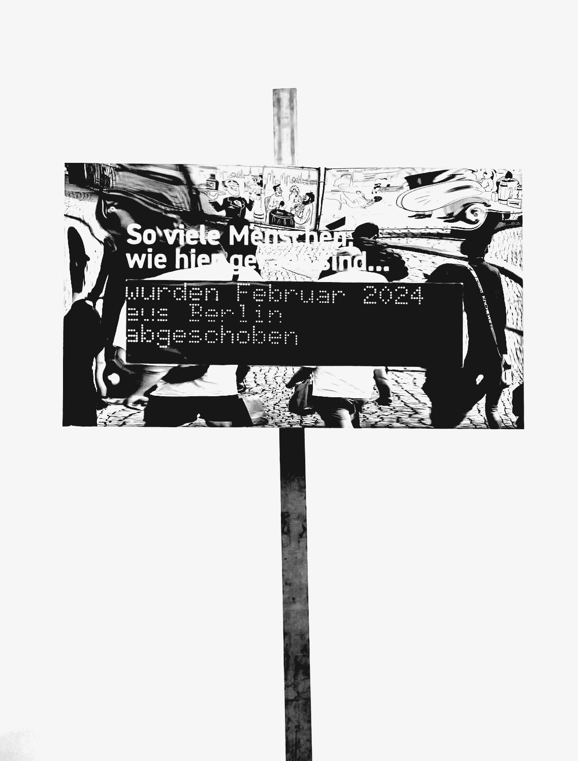Mindestens 2452 Menschen sind letztes Jahr auf ihrem Weg nach Europa über das Mittelmeer gestorben. 10 Menschen wohnen in einer Kabine in der Geflüchtetenunterkunft Berlin-Tegel. 2024 gab es in Deutschland 287 Angriffe auf Geflüchtete. Wir haben eine Installation im öffentlichen Raum aufgestellt, die diese Mengen begreifbar macht. Ein Machine-Learning-Modell zählt die Menschen auf einem Platz und stellt den passenden Fakt zu der Anzahl der Personen auf einem LED-Display dar. An diesem Projekt habe ich zusammen mit Junis Poos gearbeitet. Die Installation wurde beim Rundgang der UdK Berlin 2025 im Medienhaus ausgestellt. Zuvor hatten wir das Schild auch am Brandenburger Tor aufgestellt.