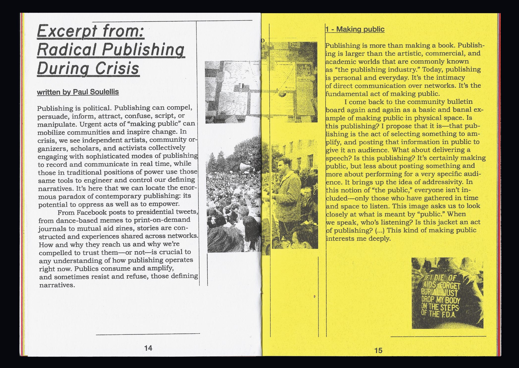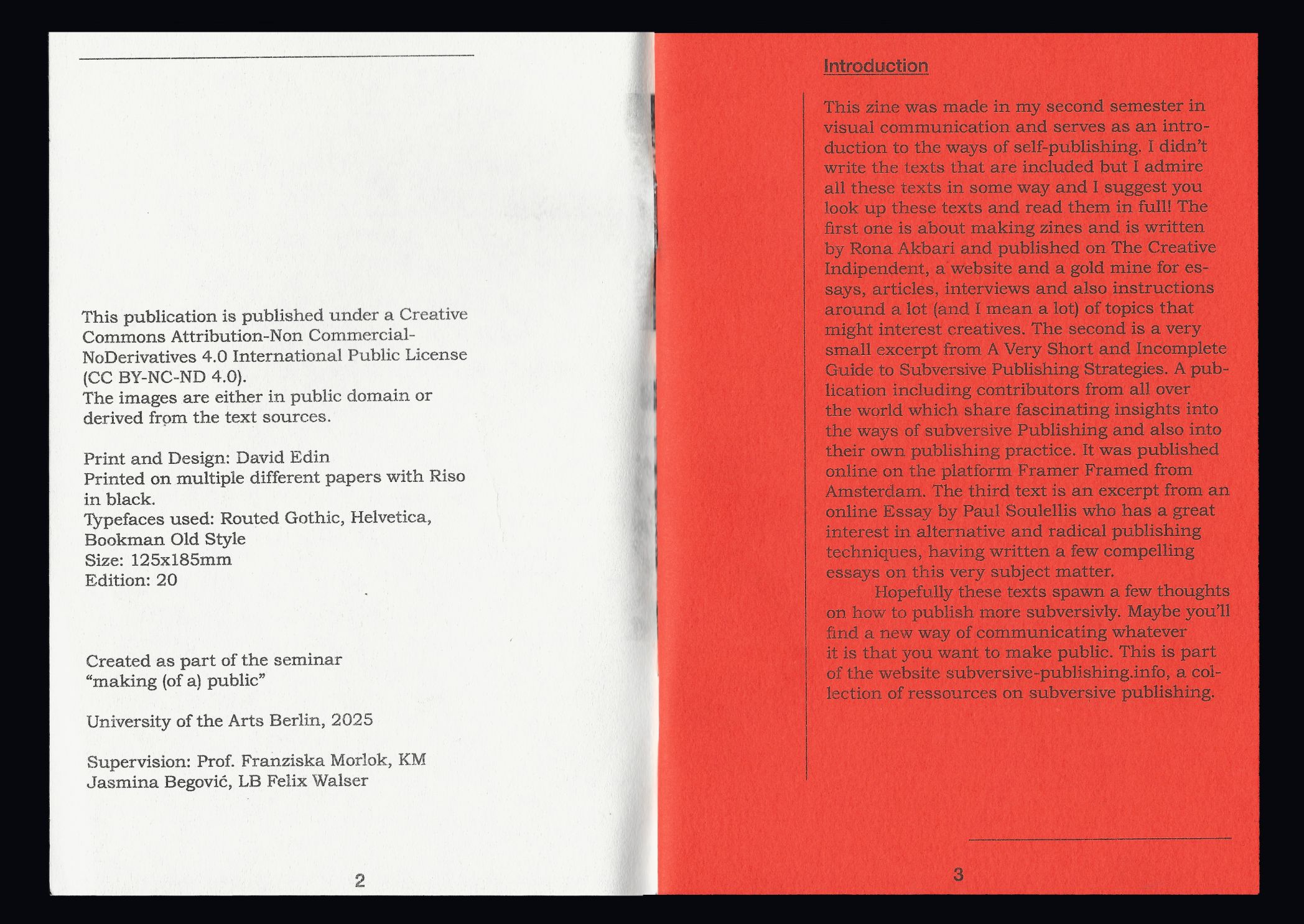 Ein Zine, welches als kurze Einführung zu alternativen oder subversiven Veröffentlichungspraktiken und Verbreitungsmethoden dient. Jedes Zine ist in Schwarz auf mehrere verschiedene Papiere mit Riso gedruckt. Es sind Auszüge aus drei spannenden Texten enthalten, die das Thema behandeln. Zusätzlich dazu gibt es eine Webseite unter der Domain subversive-publishing.info, eine Sammlung an Ressourcen, die sich mit derselben Thematik auseinandersetzen. Die dazugehörige Webseite ist im Kurs "Stay a while and listen" von Johannes Schmoll an der Universität der Künste Berlin im Sommersemester 25 entstanden.